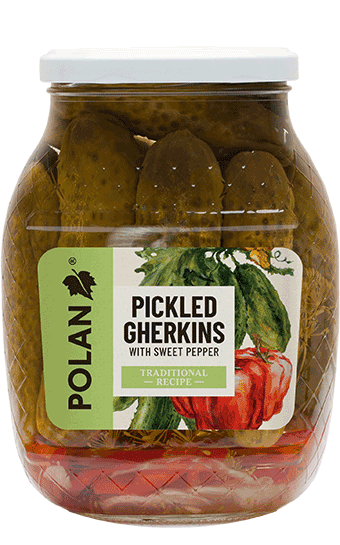Ingredients: Cucumbers 52.5%, water, spirit vinegar, sugar, sweet red peppers 6.0%, onions, salt, dill, natural flavor.